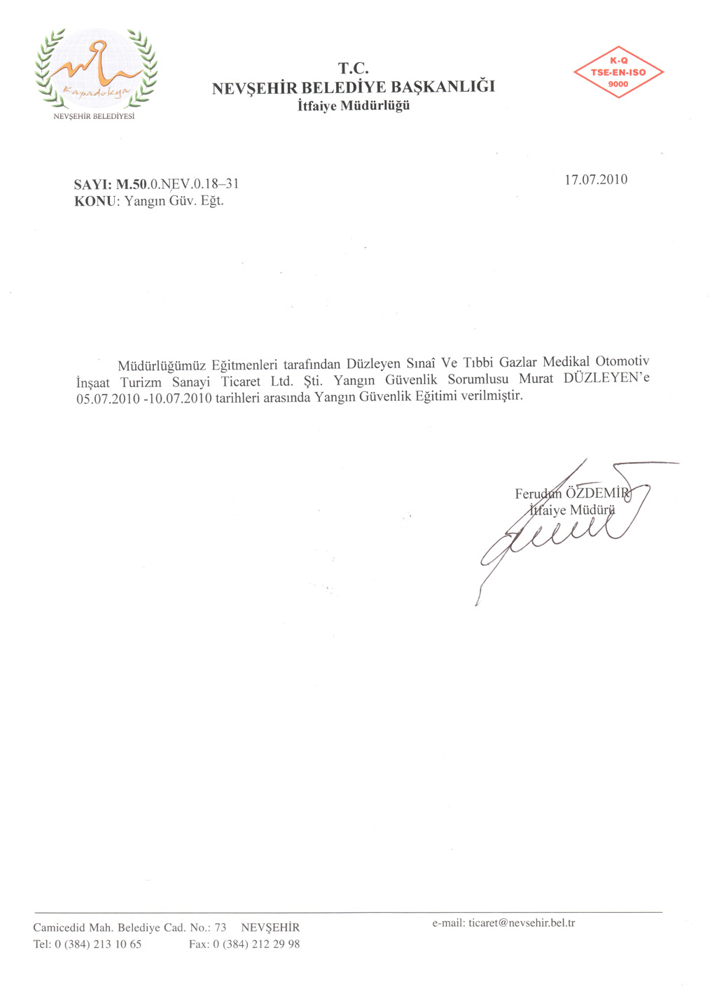 Yangın Güvenlik Eğitim Belgesi