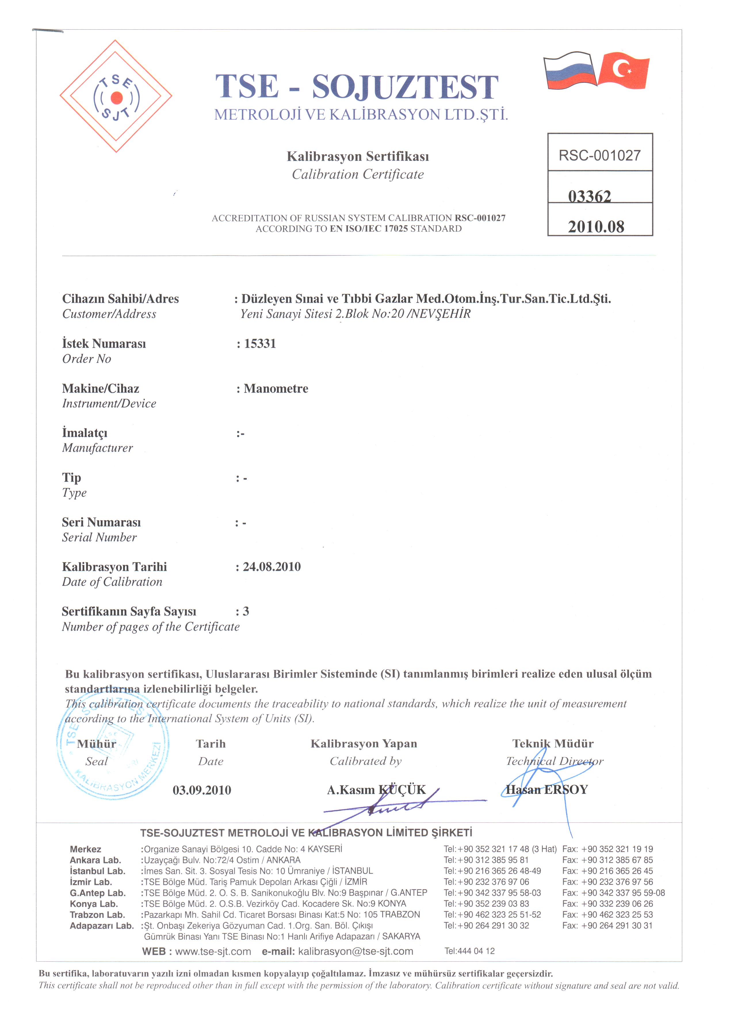 Kalibrasyon Sertifikası